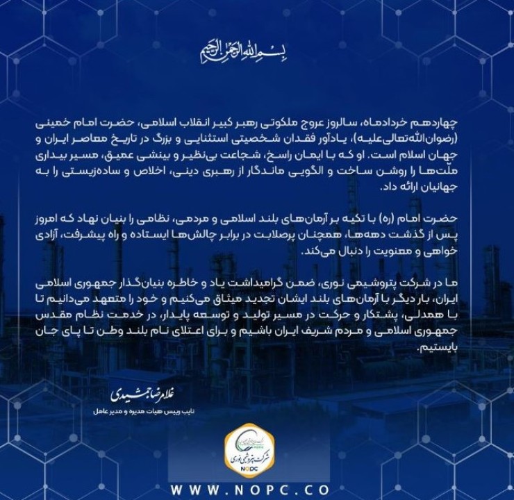 پیام دکترغلامرضا جمشیدی، مدیر عامل به مناسبت سالروز ارتحال ملکوتی بنیانگذار کبیر انقلاب اسلامی، امام خمینی (ره)