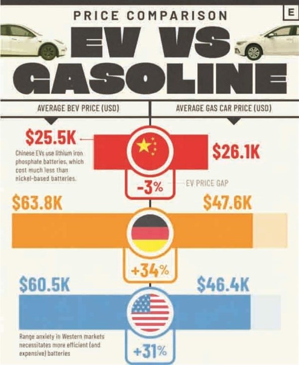 تصویر روبه‌رو، این شکاف عظیم میان چین و غرب را به تصویر می‌کشد. درحالی‌که در چین (دایره قرمز)، خودروهای برقی به‌طور متوسط 25.5 هزار دلار قیمت دارند (ارزان‌تر از 26.1 هزار دلار بنزینی)، در آلمان و آمریکا، خودروهای برقی همچنان بیش از 30 درصد گران‌تر از همتایان فسیلی خود هستند. این تصویر به‌وضوح نشان می‌دهد که «پریمیوم سبز» در چین به «تخفیف سبز» تبدیل شده است.