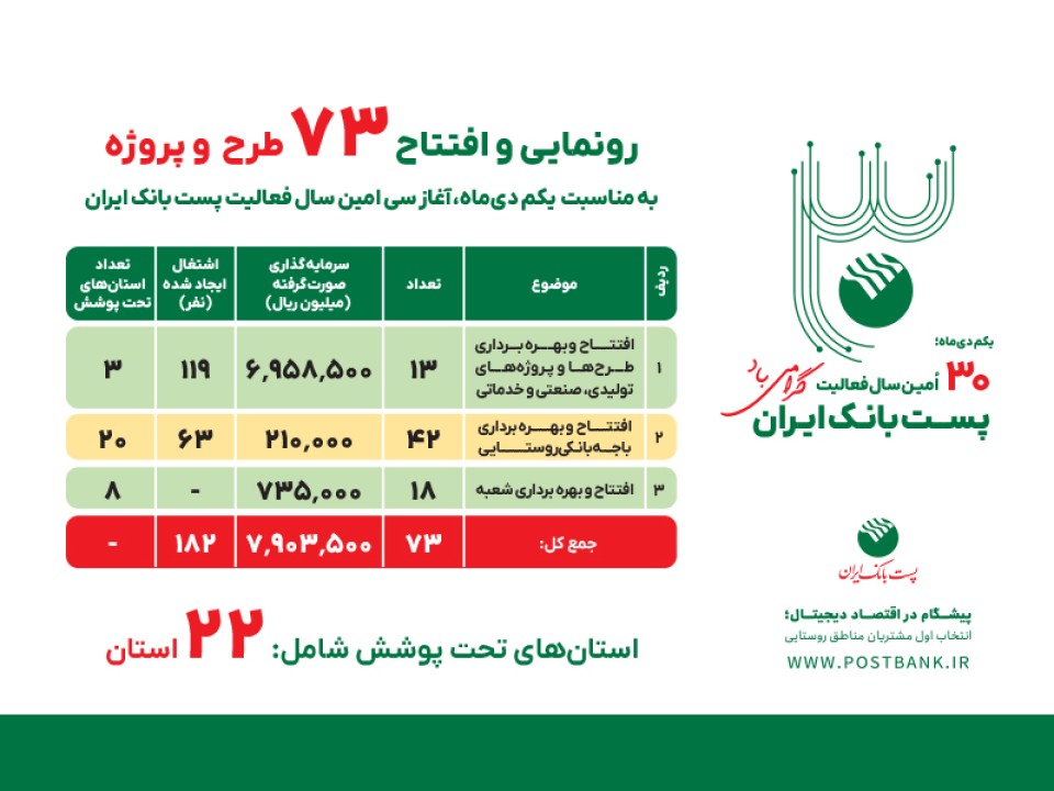 همزمان با فرارسیدن اول دی و سی‌امین سالروز فعالیت پست‌بانک ایران، ۷۳ طرح و پروژه این بانک در حوزه‌های مختلف بانکی، عمرانی، تولیدی و خدماتی در سراسر کشور رونمایی و به بهره‌برداری رسید.