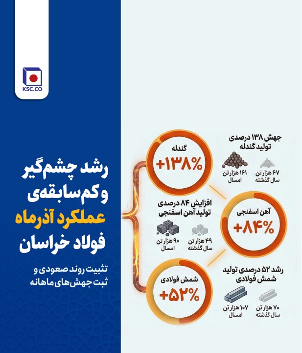 برآیند آمار تولید 9 ماهه و جهش‌های ثبت‌شده در آذرماه نشان می‌دهد مجتمع فولاد خراسان با اتکا به مدیریت موثر تولید و پشتیبانی، انسجام عملیاتی و سرمایه انسانی متخصص خود، توانسته است مسیر رشد تولید را در بخش عمده‌ای از زنجیره تثبیت کند؛ مسیری که تداوم آن، زمینه‌ساز تحقق اهداف تولیدی، افزایش تاب‌آوری عملیاتی و ارتقای جایگاه این شرکت در صنعت فولاد کشور خواهد بود.