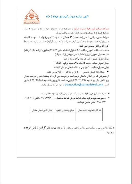 شرکت صنایع آهن و فولاد سرمد ابرکوه در نظر دارد فروش کارمزدی خود را(تحویل میلگرد در برابر دریافت شمش) از طریق مزایده به واجدین شرایط واگذار نماید.