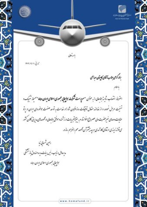 پیام تبریک دکتر رامین شمسایینیا مدیرعامل صندوق بازنشستگی هواپیمایی جمهوری اسلامی ایران "هما" به کاپیتان عبدالحی "سرپرست شرکت هواپیمایی جمهوری اسلامی ایران (هما)"