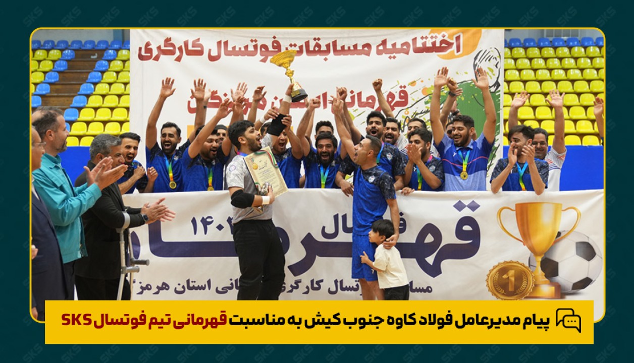 با نهایت مسرت و افتخار، قهرمانی شایسته تیم فوتسال شرکت فولاد کاوه جنوب کیش در لیگ فوتسال کارگری استان هرمزگان را صمیمانه تبریک و تهنیت عرض مینمایم.