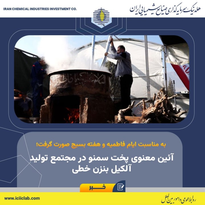 به مناسبت ایام سوگواری حضرت فاطمه زهرا (س) و در گرامی‌داشت هفته بسیج، آئین پخت سمنو برای نخستین‌ بار در مجتمع صنایع شیمیایی ایران برگزار شد.