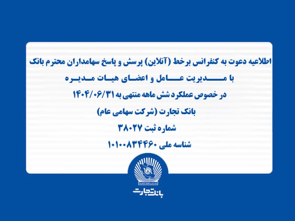 با عنایت به دستورالعمل اجرایی مدیریت نظارت بر ناشران - سازمان بورس و اوراق بهادار به شماره 122/186141 مورخ 1404/08/18؛ بدینوسیله از عموم صاحبان محترم سهام بانک تجارت (سهامی عام) و یا نمایندگان و وکلای قانونی آنها دعوت به عمل می آید تا درجلسه کنفرانس برخط پرسش و پاسخ سهامداران محترم با مدیریتعامل و یکی از اعضای هیاتمدیره بانک که به منظور ارائه گزارش درخصوص عملکرد شش ماهه منتهی به 1404/06/31که رأس ساعت 14روز سهشنبه مورخ 1404/09/18 تشکیل میگردد، شرکت نمایند .
