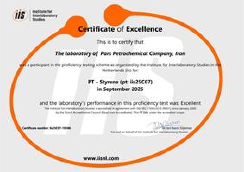 آزمایشگاه شرکت پتروشیمی پارس موفق شد در آزمون مهارت بینالمللی استایرن منومر (Styrene Monomer) که توسط Institute for Interlaboratory Studies (IIS) در کشور هلند برگزار شد، گواهی عملکرد عالی (Certificate of Excellence) را دریافت کند.