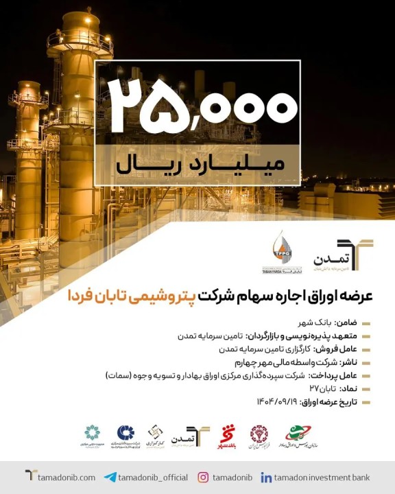 پذیرهنویسی اوراق اجاره سهام شرکت گروه پتروشیمی تابان فردا به ارزش 25 هزار میلیارد ریال از امروز چهارشنبه 19 آذرماه به مدت سه روز کاری با نماد تابان27 در بازار ابزارهای نوین مالی شرکت فرابورس ایران آغاز شد؛ انتشاری بزرگ که در آن تامین سرمایه تمدن نقش متعهد پذیرهنویسی، بازارگردانی را بر عهده دارد. و همچنین لازم به ذکر است مشاور عرضه این اوراق نیز بر عهده تامین سرمایه تمدن بوده است.